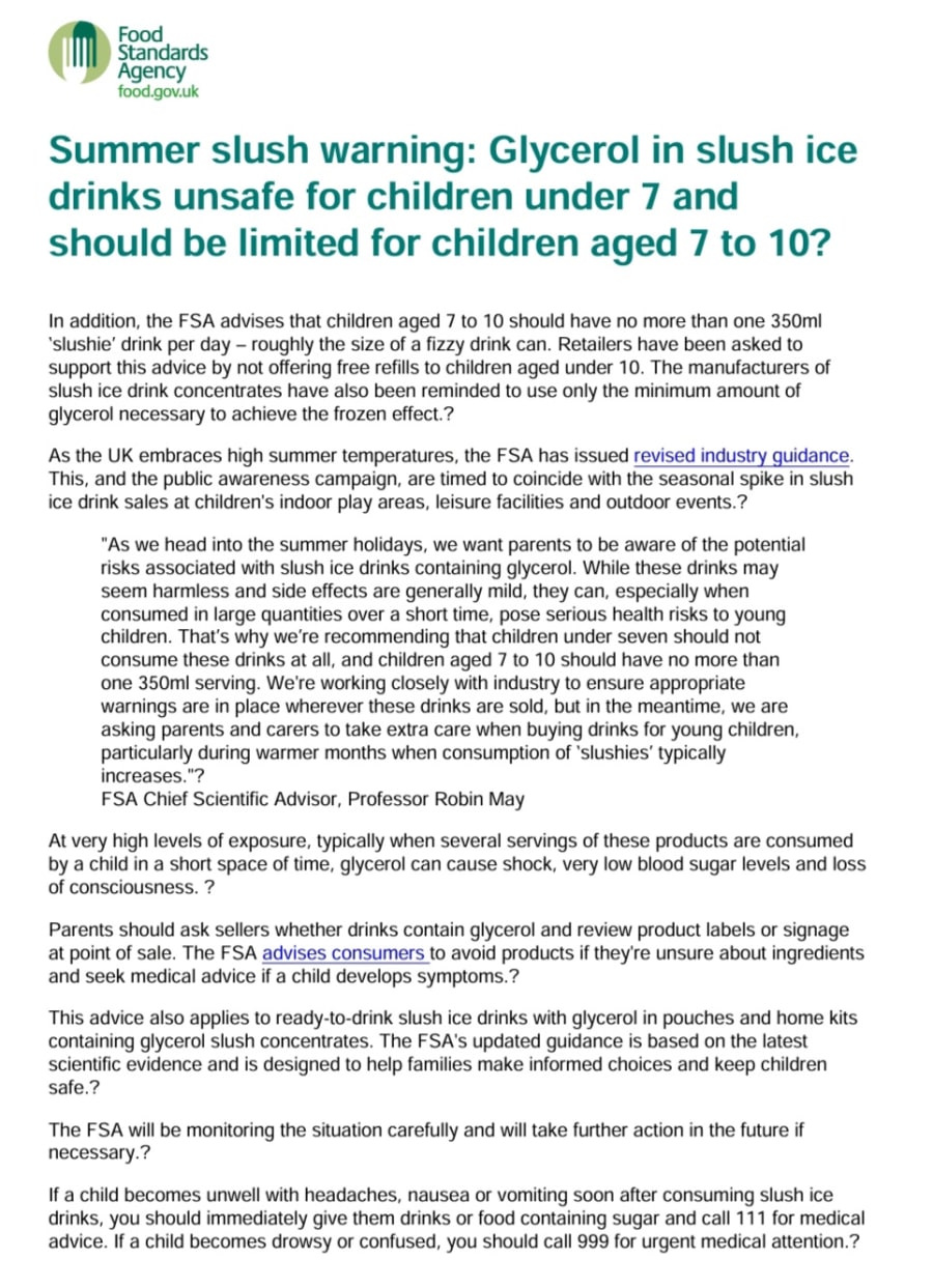 Note: All flavours listed above contain Glycerol which is unsuitable for children under 7 years old and should be consumed in moderation (i.e. one slush per day per child up to 10 years old) as recommended by the Food Standards Agency.