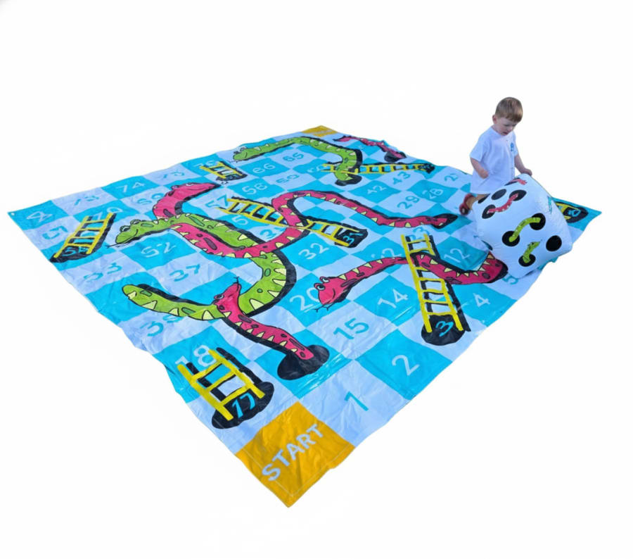 Turn any space into a playful arena with the Giant Snakes and Ladders mat and inflatable dice. This oversized version of the timeless board game creates instant fun for families, schools, events, and parties. Bright graphics and large numbered squares make play easy to follow. Quick to set up. Easy to store. Perfect for indoor and outdoor use. 🌟
